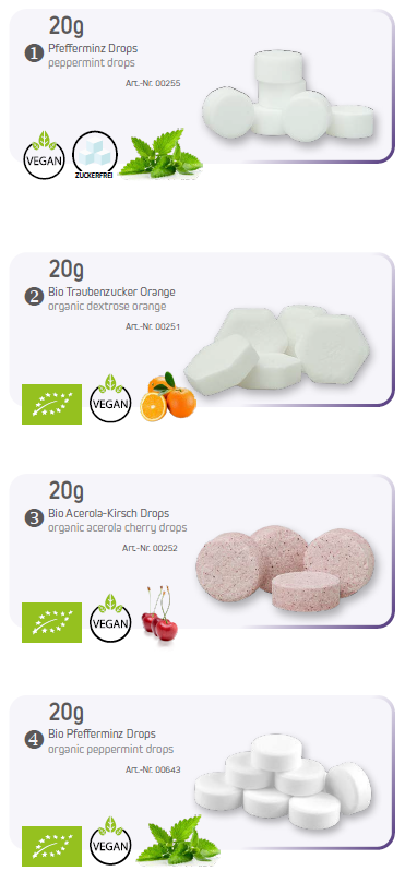 Pastillit pyöreässä clic clac rasiassa. Neljä makuvaihtoehtoa: piparminttu, luomu dekstroosi appelsiini, luomu piparminttu, luomu acerola kirsikka.